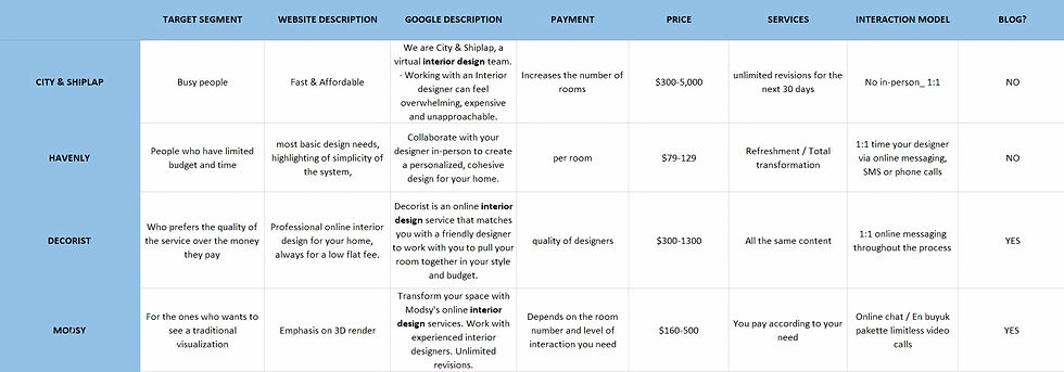 As the online interior design is a huge market, there were so many competitors to study. The price range, the emphasis of their brands, and the target audience they chose were all different from the other. However, seeing the median of the popular brands helped me where to place Storie Design in the market.
